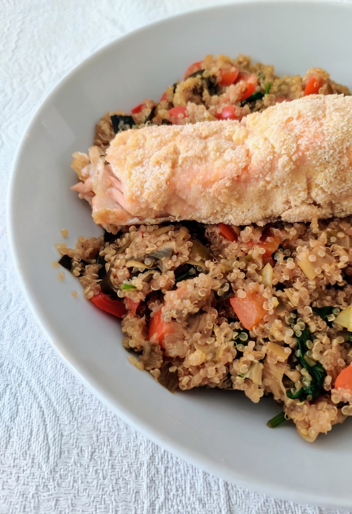 Breaded Salmon with Warm Quinoa Salad was a tasty meal that we all enjoyed. It was an easy dish to prepare and cook. It would make a delicious leftover lunch the next day too. The salmon can be be in advance of the meal and stored in the fridge. The quinoa could also be made in advance and frozen too. However you decide to eat this dish, as always, please enjoy. Thank you xxx