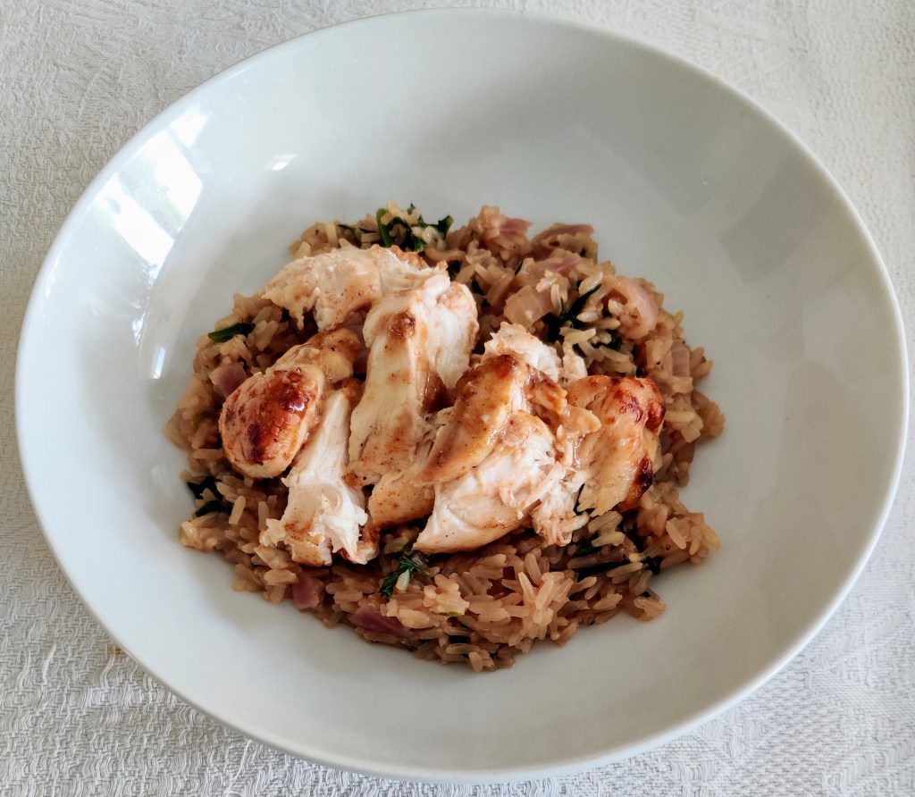 - Once all the liquid has disappeared from the pan, serve into the bowl and put the chicken on top.
