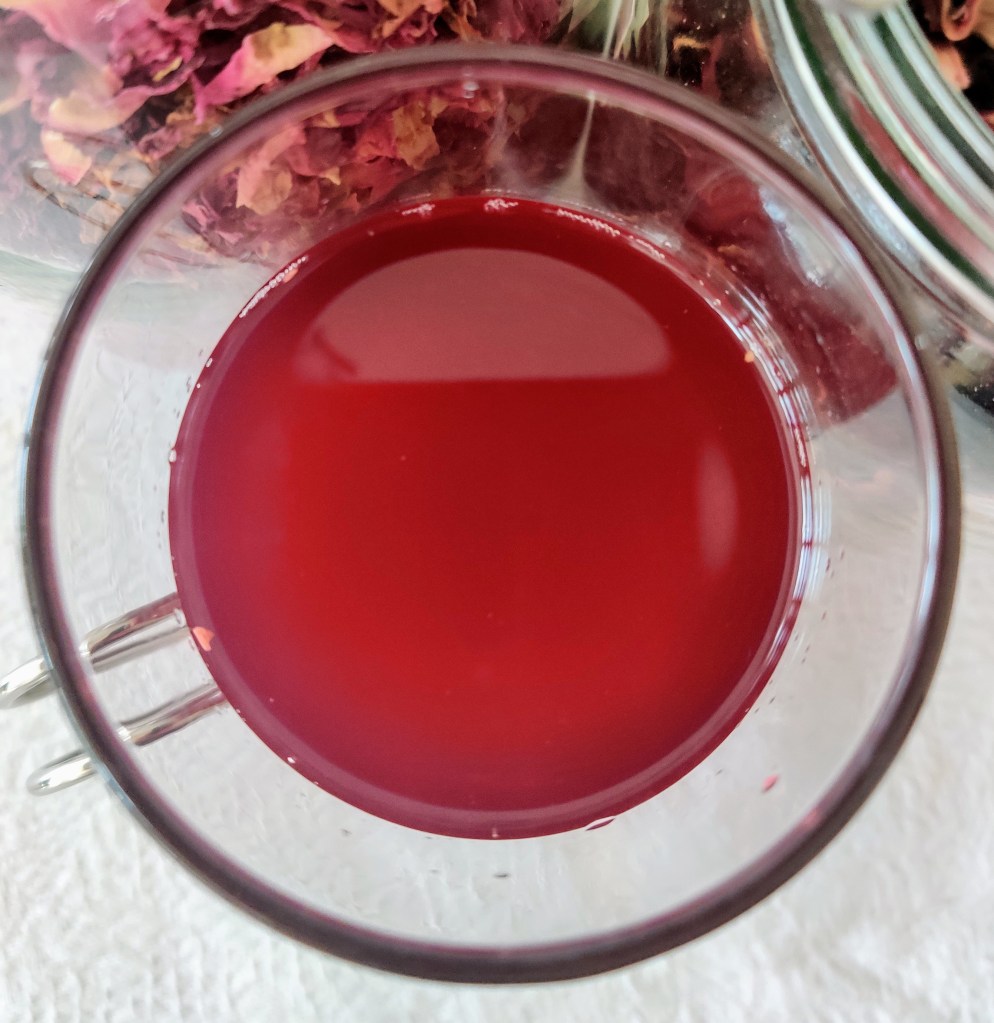 - Put the dried hibiscus and rose leaves into the glass jug or bowl.