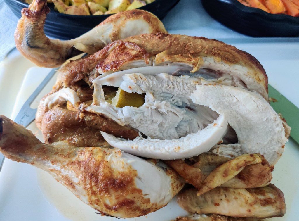 Traditional roast dinners are delicious and we love a roast. Especially on a Sunday. The traditional day to eat one. I also enjoy change and creating new meals for us to eat and share. I decided to make a roast chicken tandoori style in the oven. In the past I have used the slow cooker to cook the chicken but I wanted to leave that in the cupboard this time. I’m so pleased I did as this creation was so tasty. It’s one Sunday dinner we are going to be eating again soon.