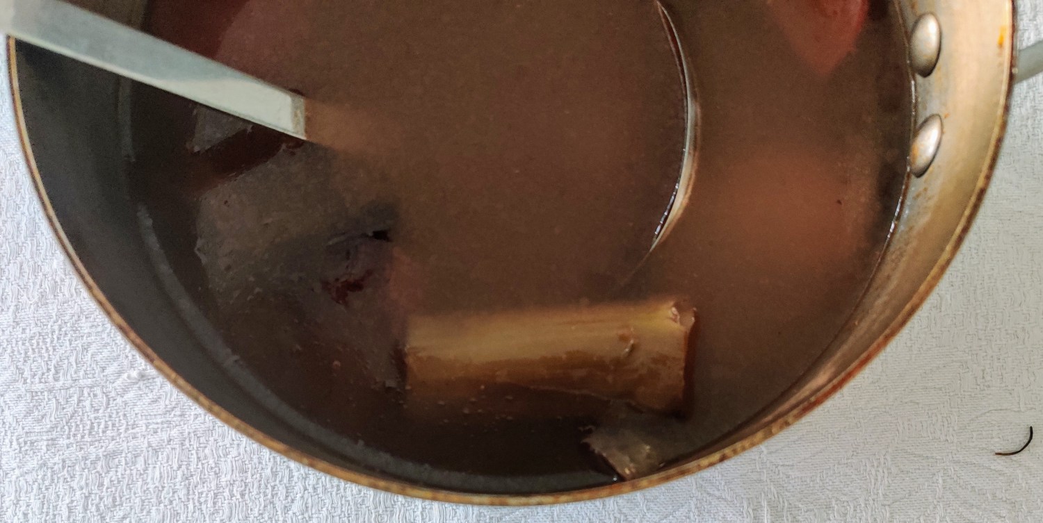 - When it’s cooled completely pour the stock through a colander and into a jug.
