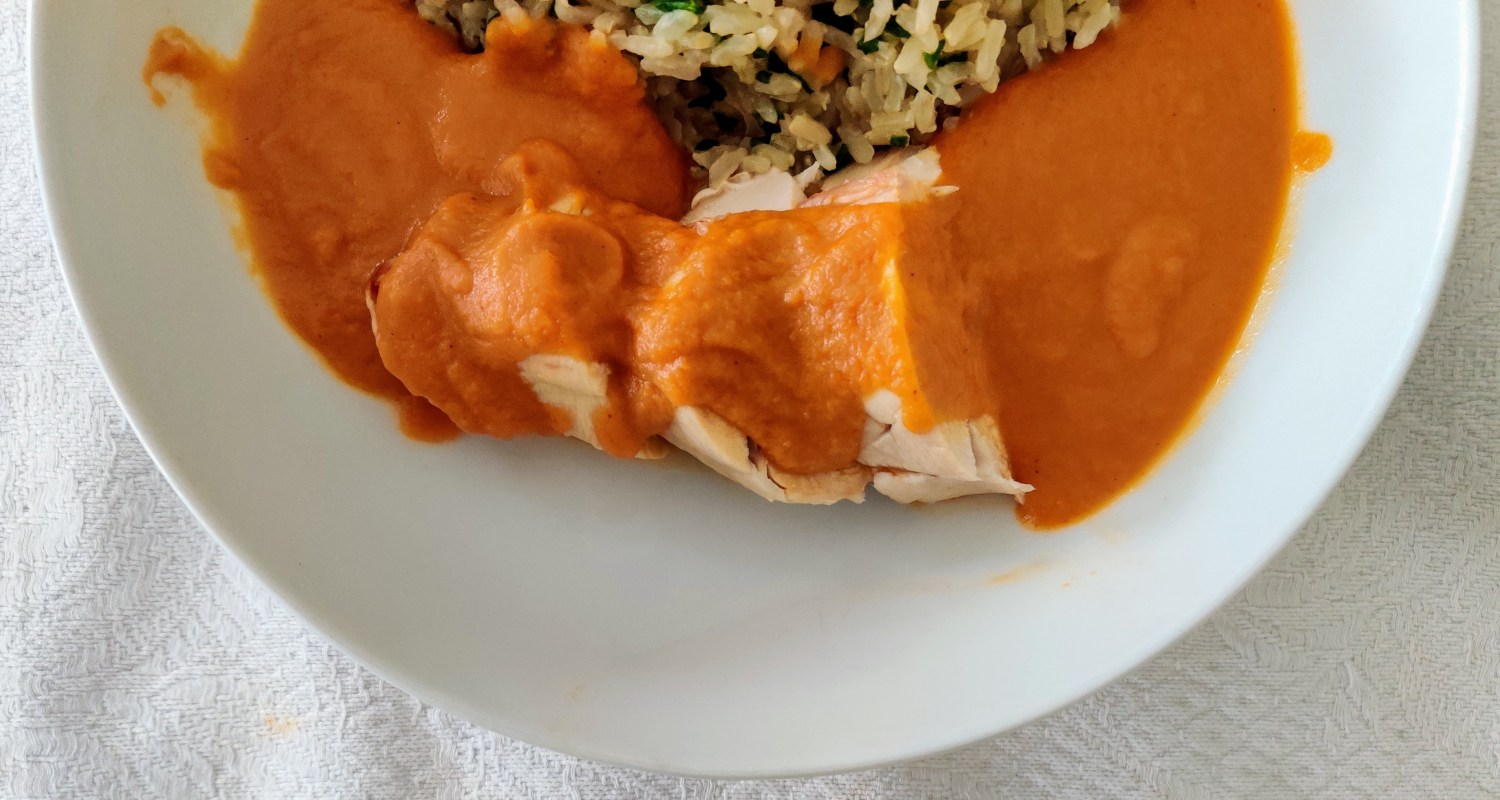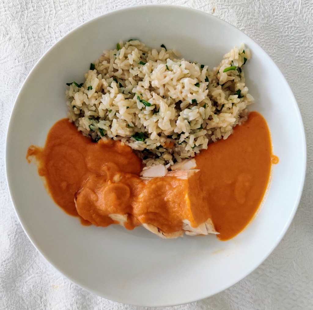 - Leave the chicken to rest for 10 minutes then slice and serve with the rice and pour the sauce over the top of the chicken.