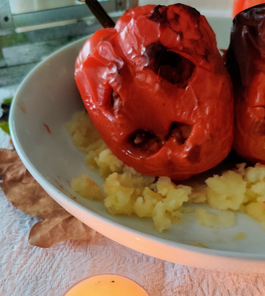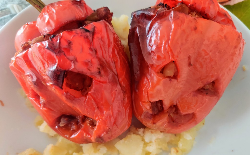 - Place the potatoes on the plate and then add 1 – 2 peppers on as well.