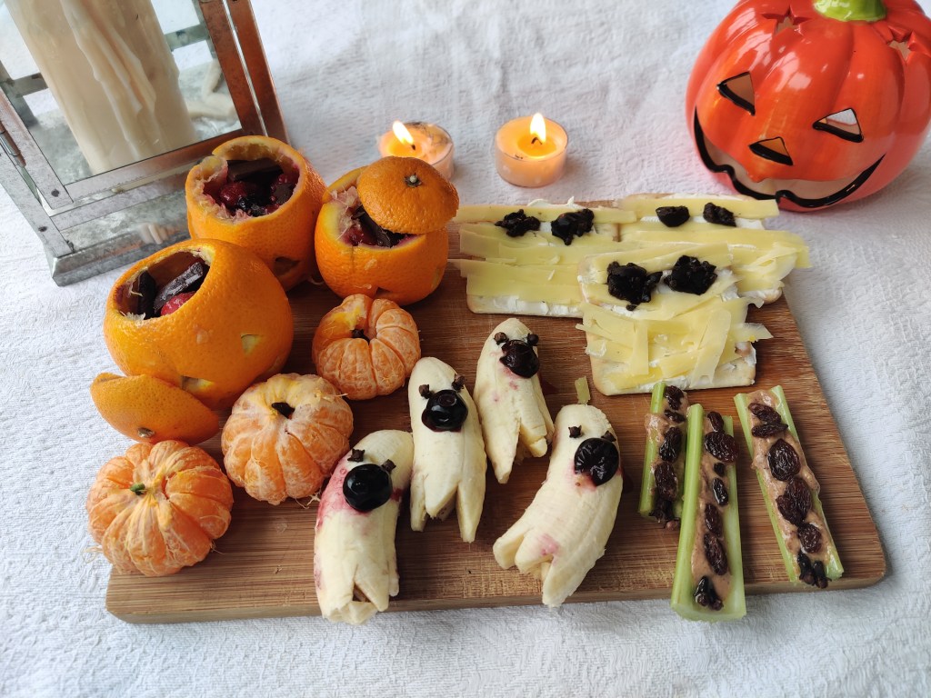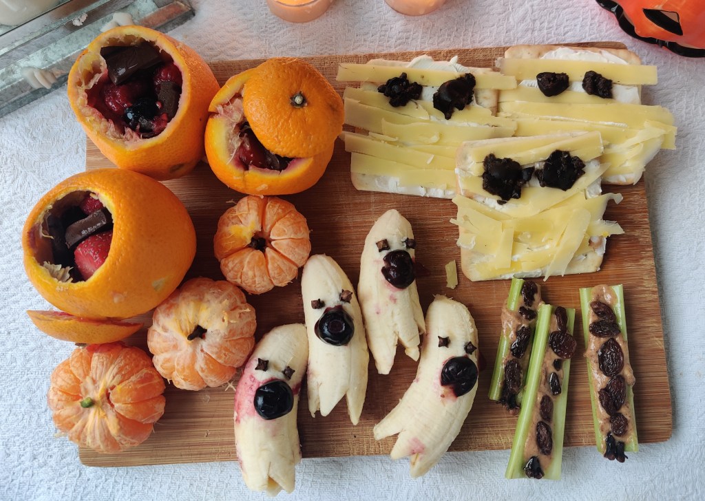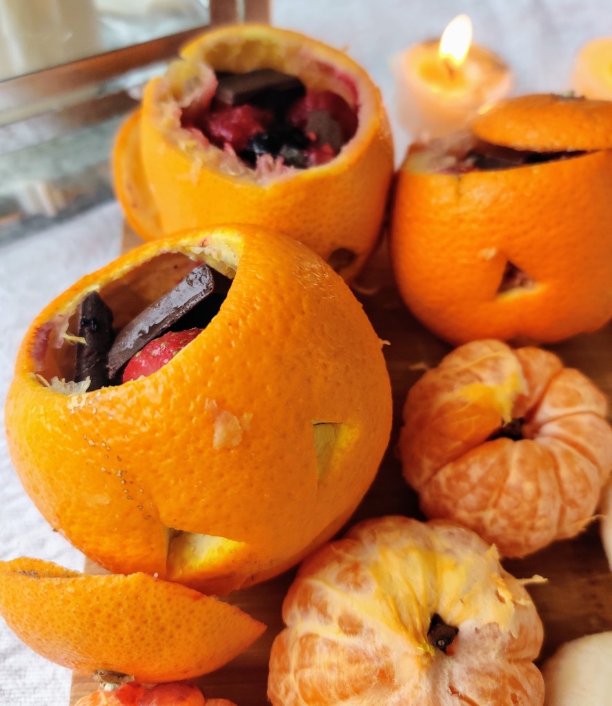 - Once the face have been cut fill the orange cups with fruit and chocolate.
