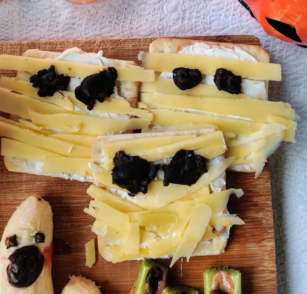 - Place like bandages onto the cracker leaving a gap for the eyes.