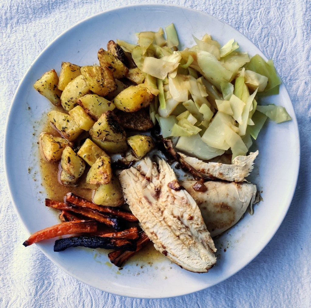 - When it has rested carve the chicken and serve with roast potatoes, carrots, parsnip and green beans or cabbage.