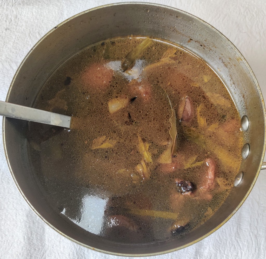 - Finally, when all the liquid has been strained and the bones have been removed, put all the ingredients in the colander back into the saucepan.