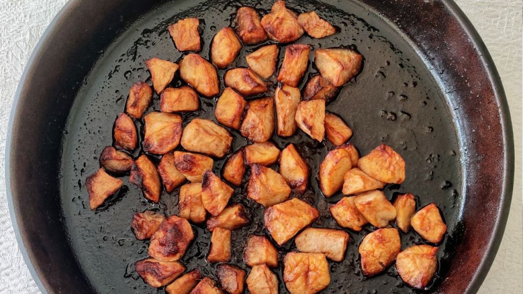 - Once it has mostly melted add in the apples and toss them in the oil.