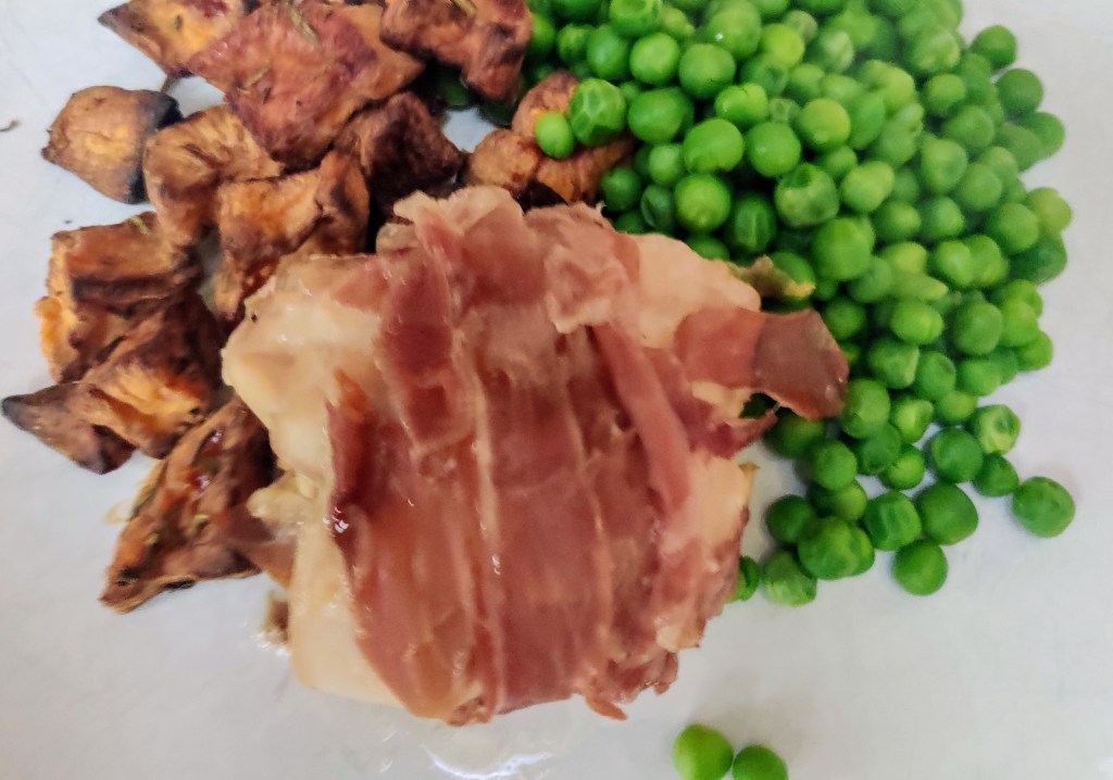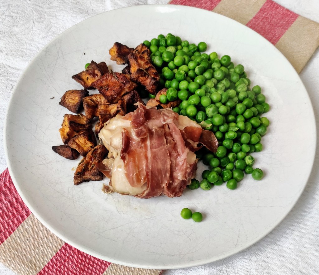 Slow Cooker Roast Chicken Wrapped in Parma Ham with Garlic Ghee was a delicious dinner. It was easy to prepare and cook. The chicken could be prepared the day before and stored in the fridge overnight. It was so tasty with roast potatoes and cabbage. The leftovers were good in a pasta salad the next day too. However you decide to eat this dish, as always, please enjoy. Thank you. xxx