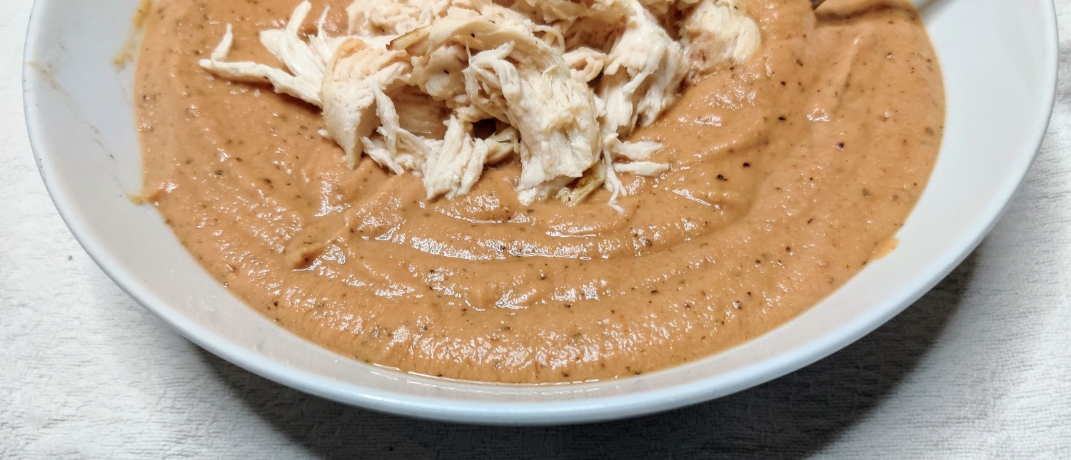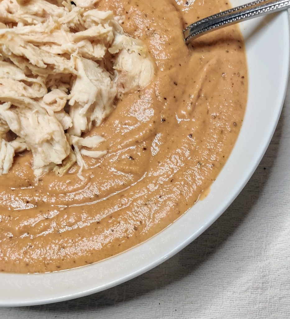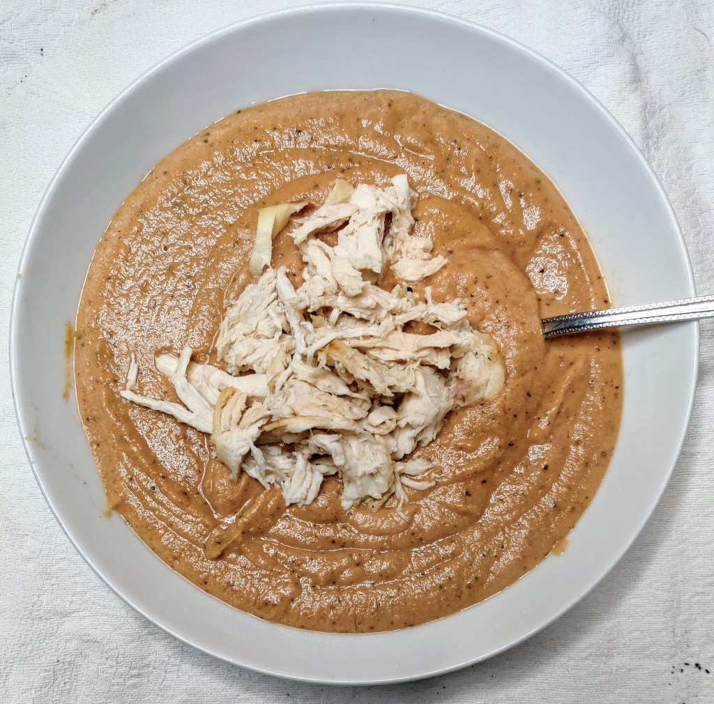 In the past I would have made a tomato soup with beans. It suddenly dawned on me that it’s not enough protein. So I decided to add chicken and hey presto, I’m walking away from the table not hungry for the sweet stuff.
