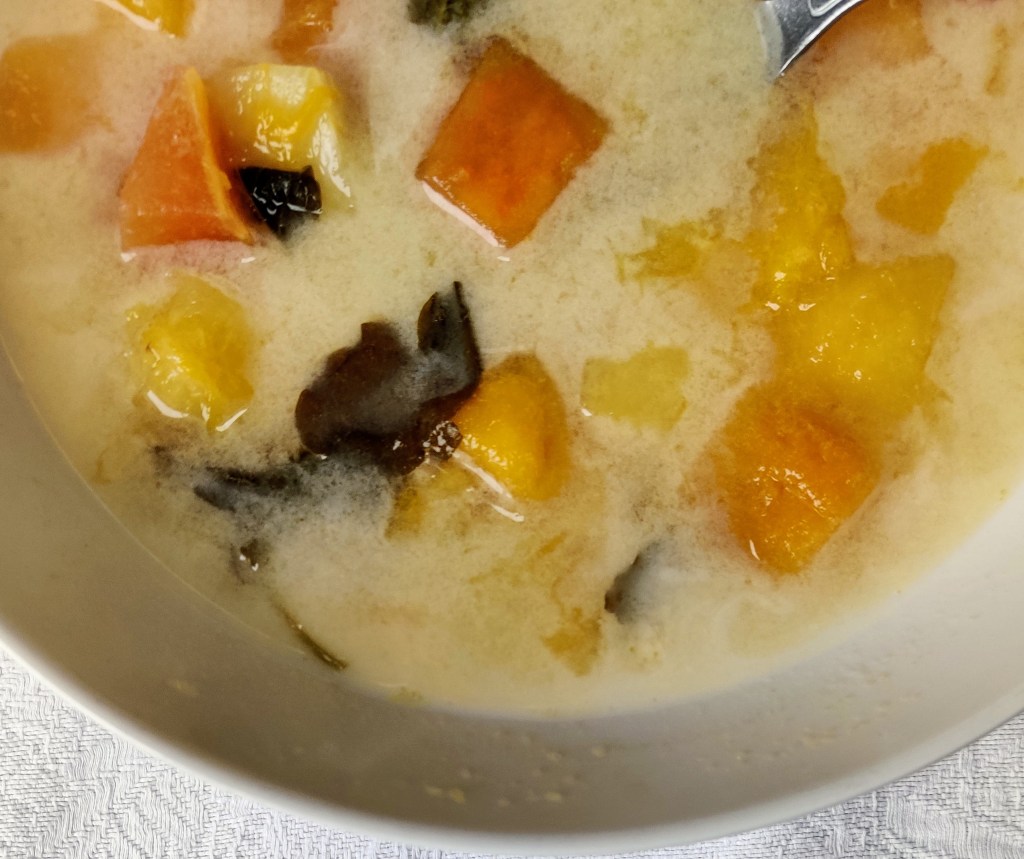 - Pour the soup into a bowl and add the coconut cream or cream.