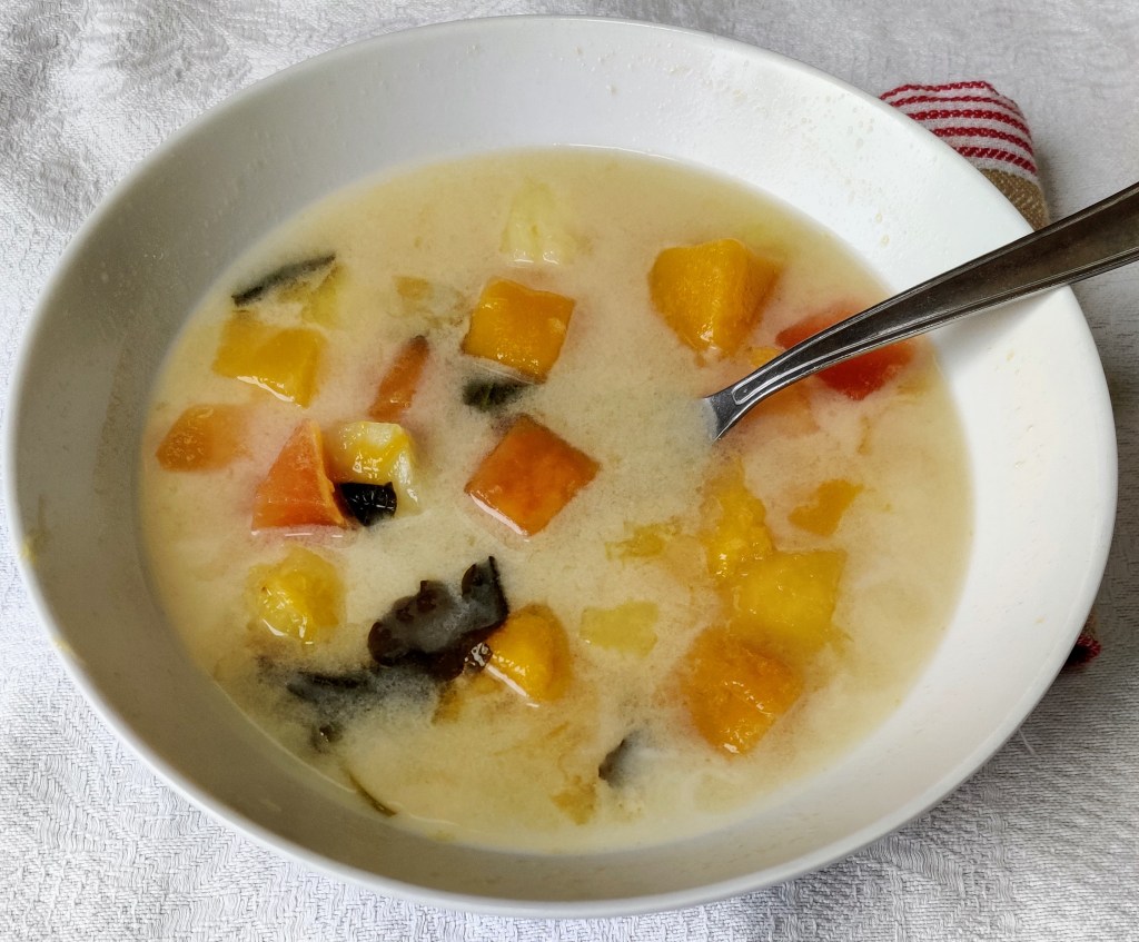 Mint and Tropical Fruit Soup was a delicious way to enjoy tropical fruit in winter. It was very easy to prepare and cook. was a delicious way to enjoy strawberries in winter. It was very easy to prepare and cook. It could be made in advance of a meal and frozen. The soup made a lovely sweet treat after my dinner but it would also make a very nice snack too. However you decide to drink/eat this soup, as always, please enjoy. Thank you. xxx