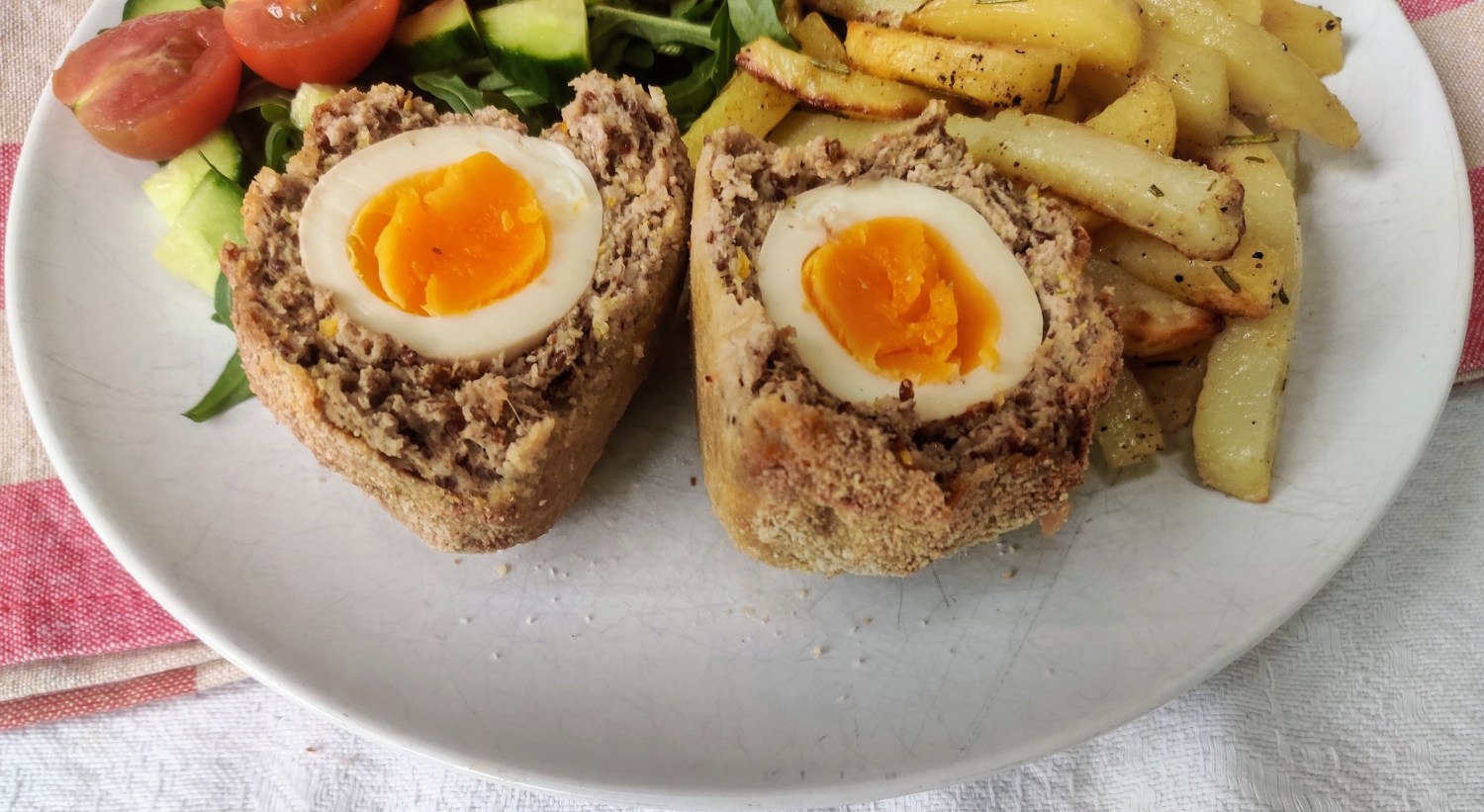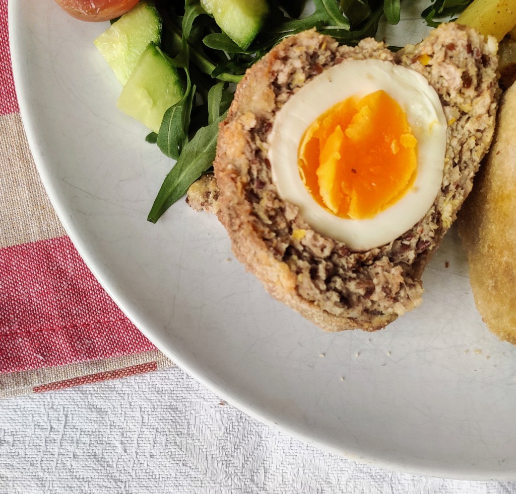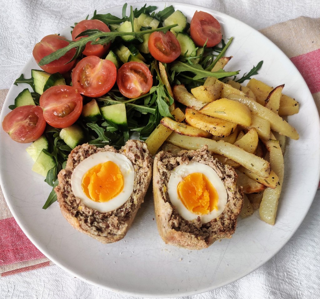 Harissa Spice Pork Scotch Eggs were a hit in our house. I served these with chips and salad. It was a yummy dinner and Howard and Ted both cleaned their plates. That’s unheard of in our house. As I mentioned earlier these scotch eggs could be made for a packed lunch or could be eaten for breakfast as well. Plus they would be good served at a party too. However you decide to eat this dish, as always, please enjoy. Thank you xxx