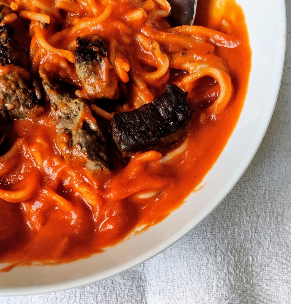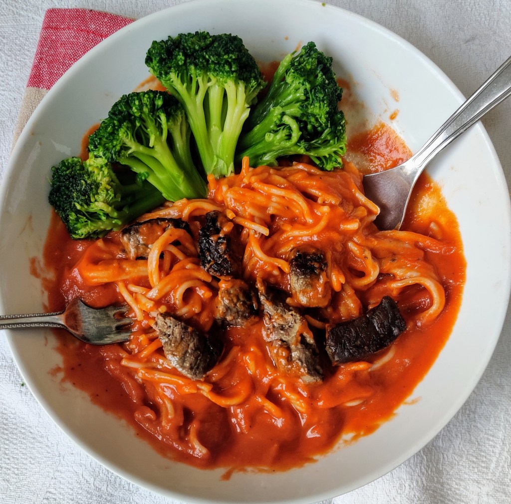 Once everything was cooked I put the steak, the sauce and the pasta on the table so that my little family could help themselves. Ted did try the sauce but he’s still not the biggest fan. At least he tried it though. My husband and I loved it and we hope you enjoy it too.
