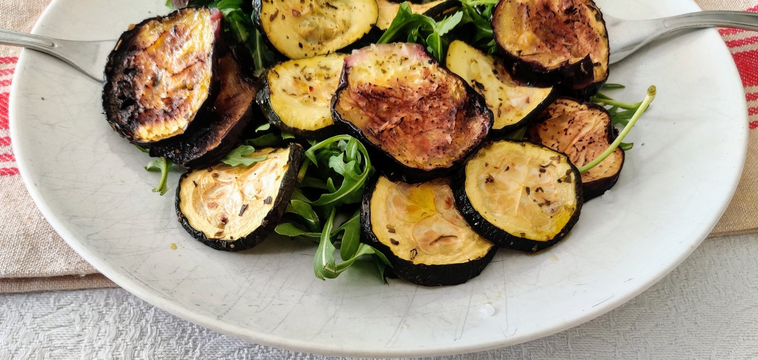 - Slice the aubergine and courgette into 1/4 centimetre rounds.