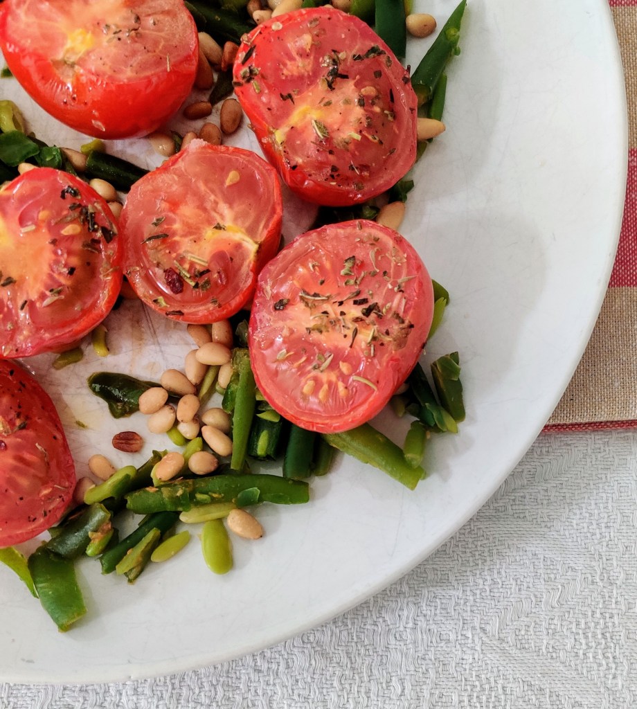 My husband Howard is a master at making grill tomatoes for a fry up. A few years ago Howard decided to add dried mixed herbs to the tomatoes and it was delicious. Shh, don’t tell him but I’ve decided to steal his idea for a salad. As much as I love a fry up I love salad the same way. I thought I would add Howard’s idea to green beans and pine nuts. I have made a similar recipe in the past but I thought I would give it a new lease of life. I really enjoyed this one and I hope you will too.