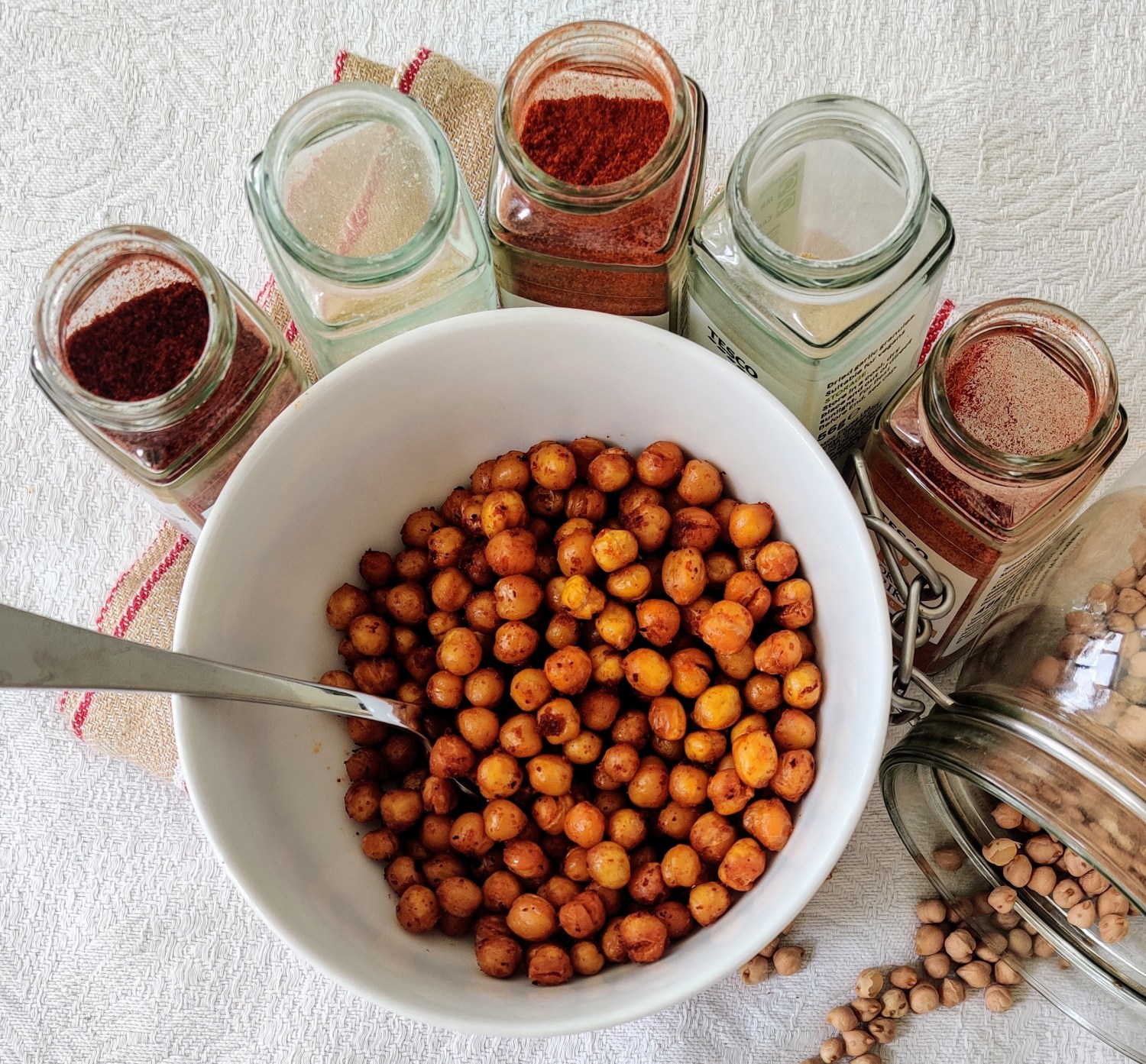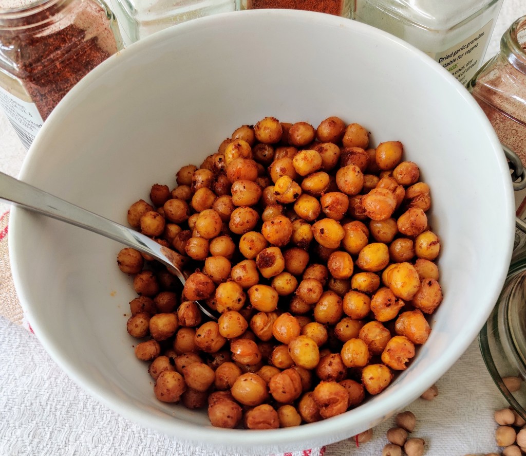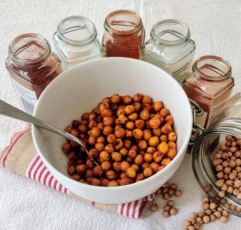 To be honest, I try not to eat in between meals but occasionally I get a little hungry. Nowadays I try to eat high protein snacks. Chickpeas are a great source of protein and they are also high in fibre too. Roasting chickpeas can give them a little bit of crunch which can be a craving for me. Therefore this makes an ideal high protein, high fibre crunchy snack. I love it and I hope you will too.