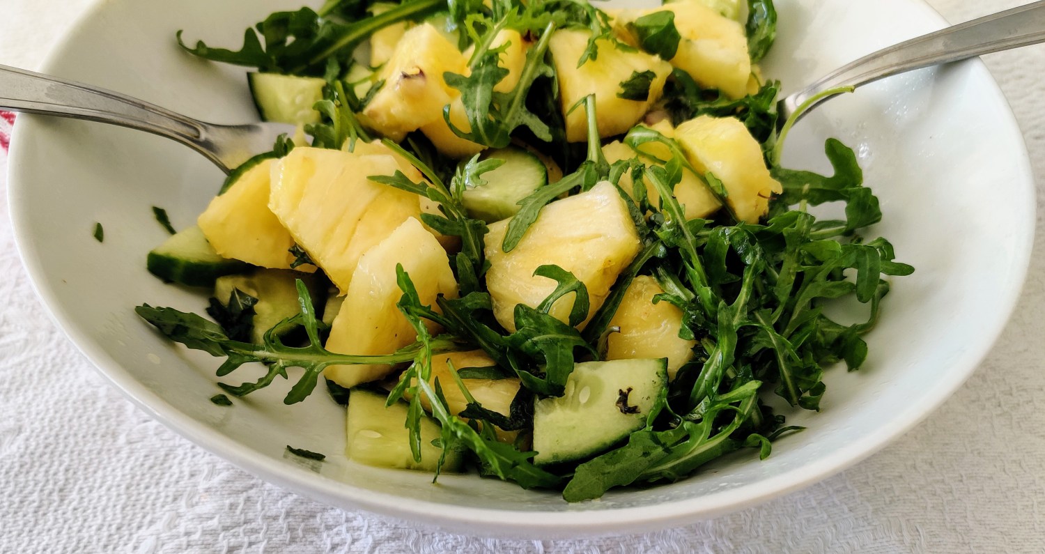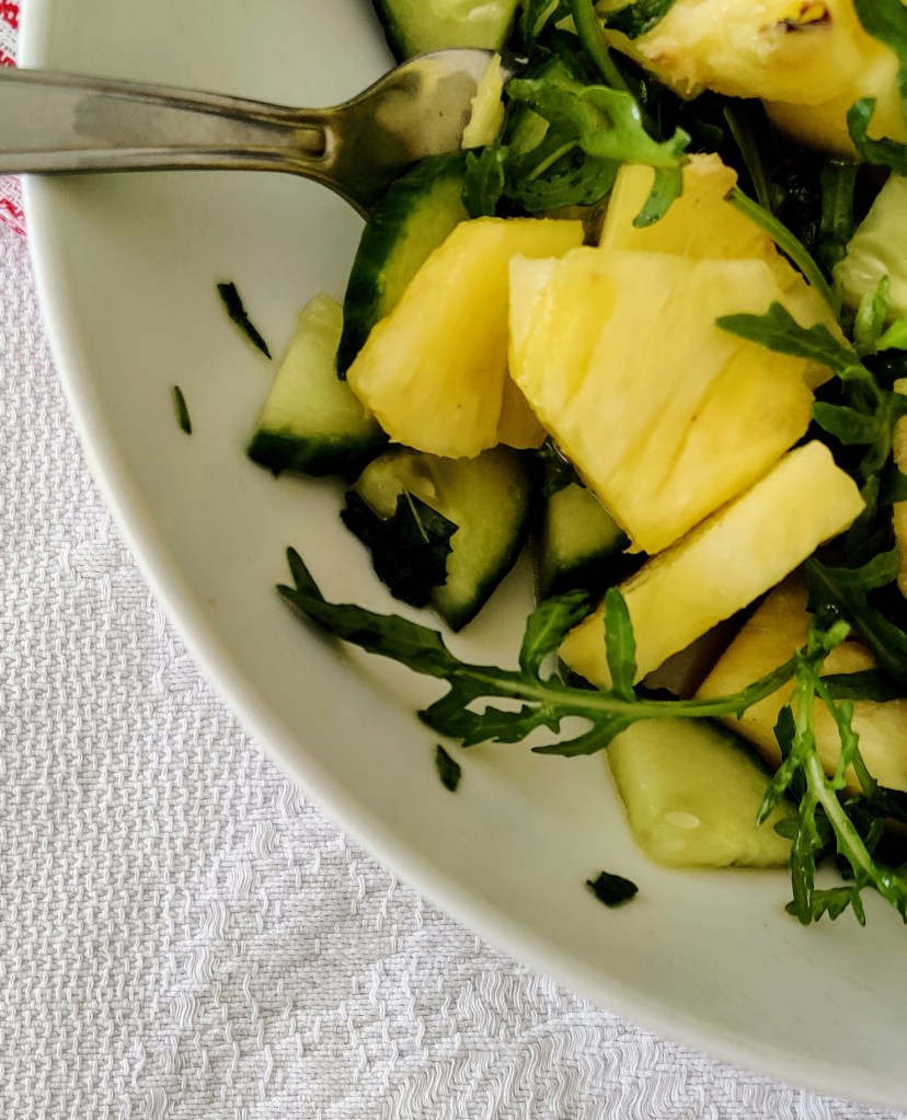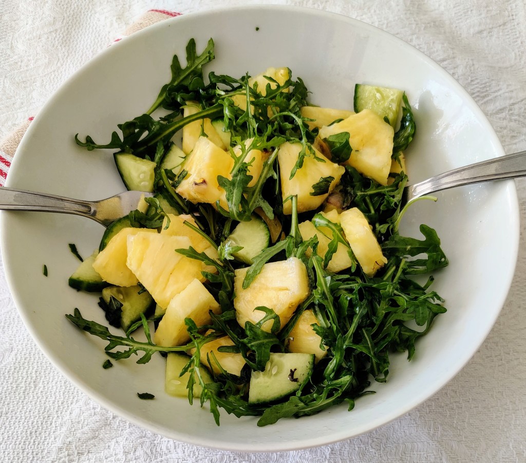 Until recently I would never have thought to put pineapple in a salad. Since reading Hugh Fernley Whittingstall’s book called Vegetables I’ve been inspired to make my salads more interesting. Pineapple and mint are a brilliant flavour combination. In the past I have made an ice cream using these two ingredients.