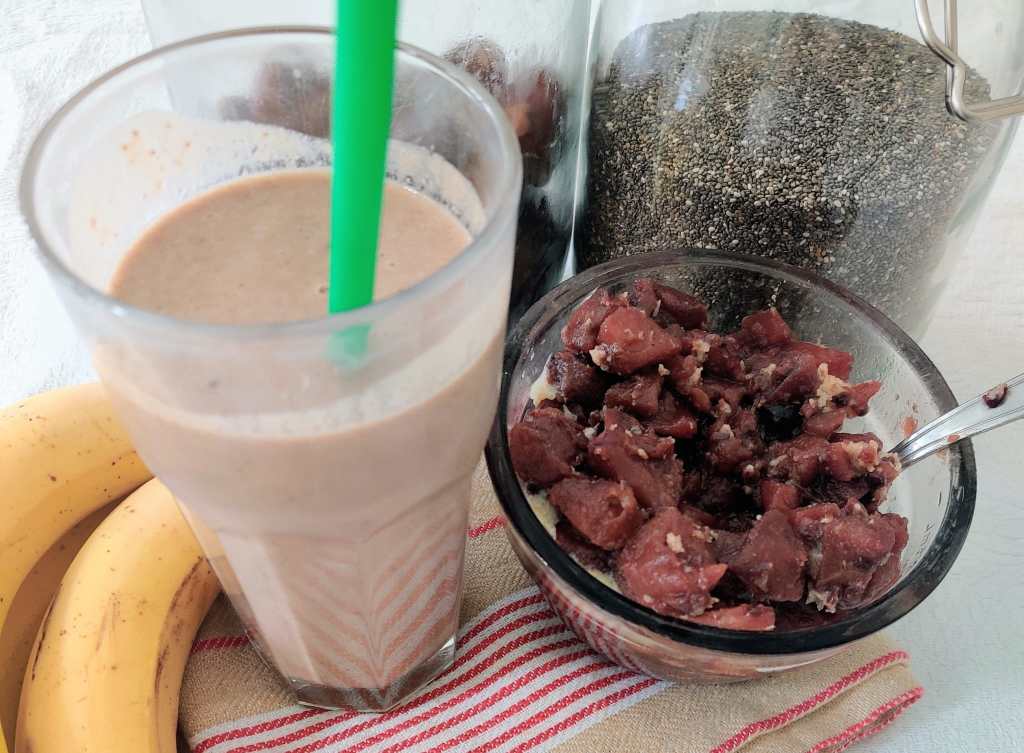 - Add in the banana, chia seeds, protein powder, dates, water and ground sweet cinnamon.