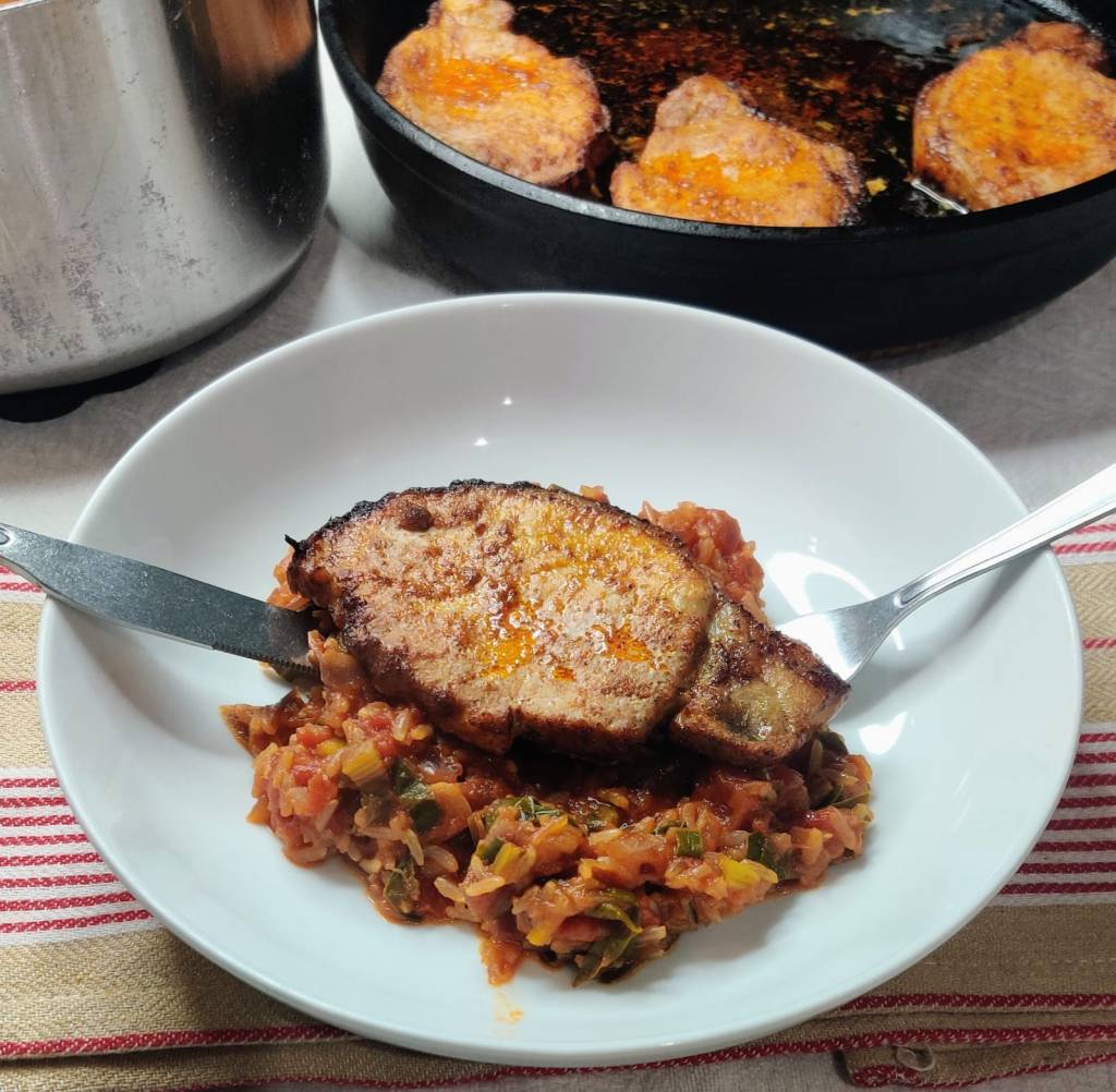 - Slice the pork chops and serve with the rice.