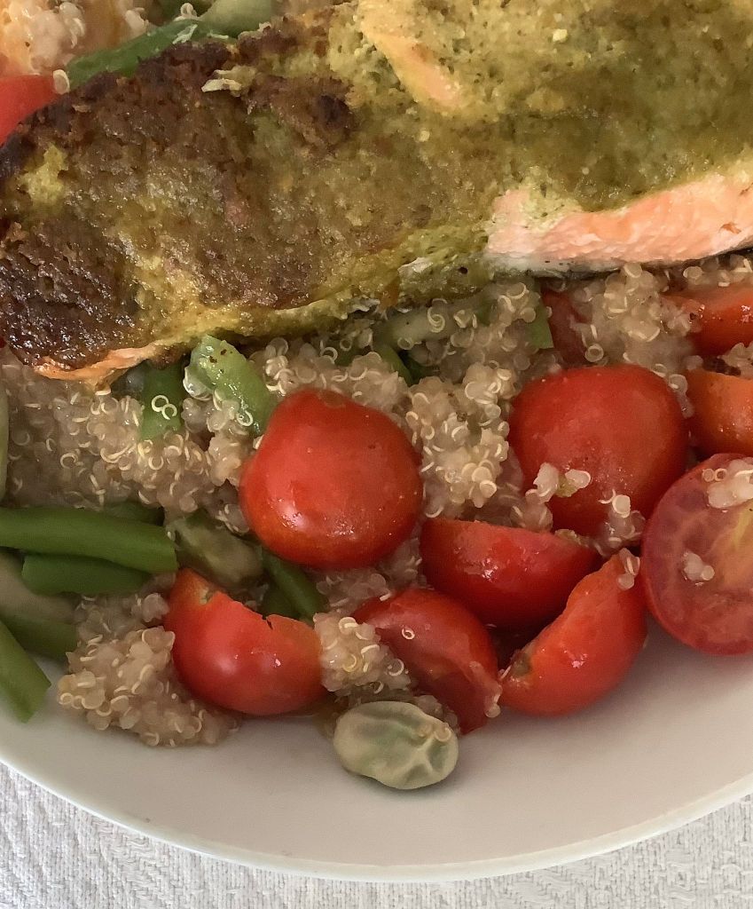 Celebrate Christmas Eve with a dish that’s full of flavour, comfort, and family tradition. My Salmon Pesto Quinoa Salad is inspired by my dad, who always made fish on Christmas Eve. It’s quick, simple, and wonderfully festive. The kind of recipe that brings everyone together without the stress of a long cook. Fresh salmon, herby pesto, and fluffy quinoa come together in a vibrant bowl that’s perfect for a cosy holiday dinner or a lighter option between all the hearty Christmas treats. Below is a video and recipe for you.