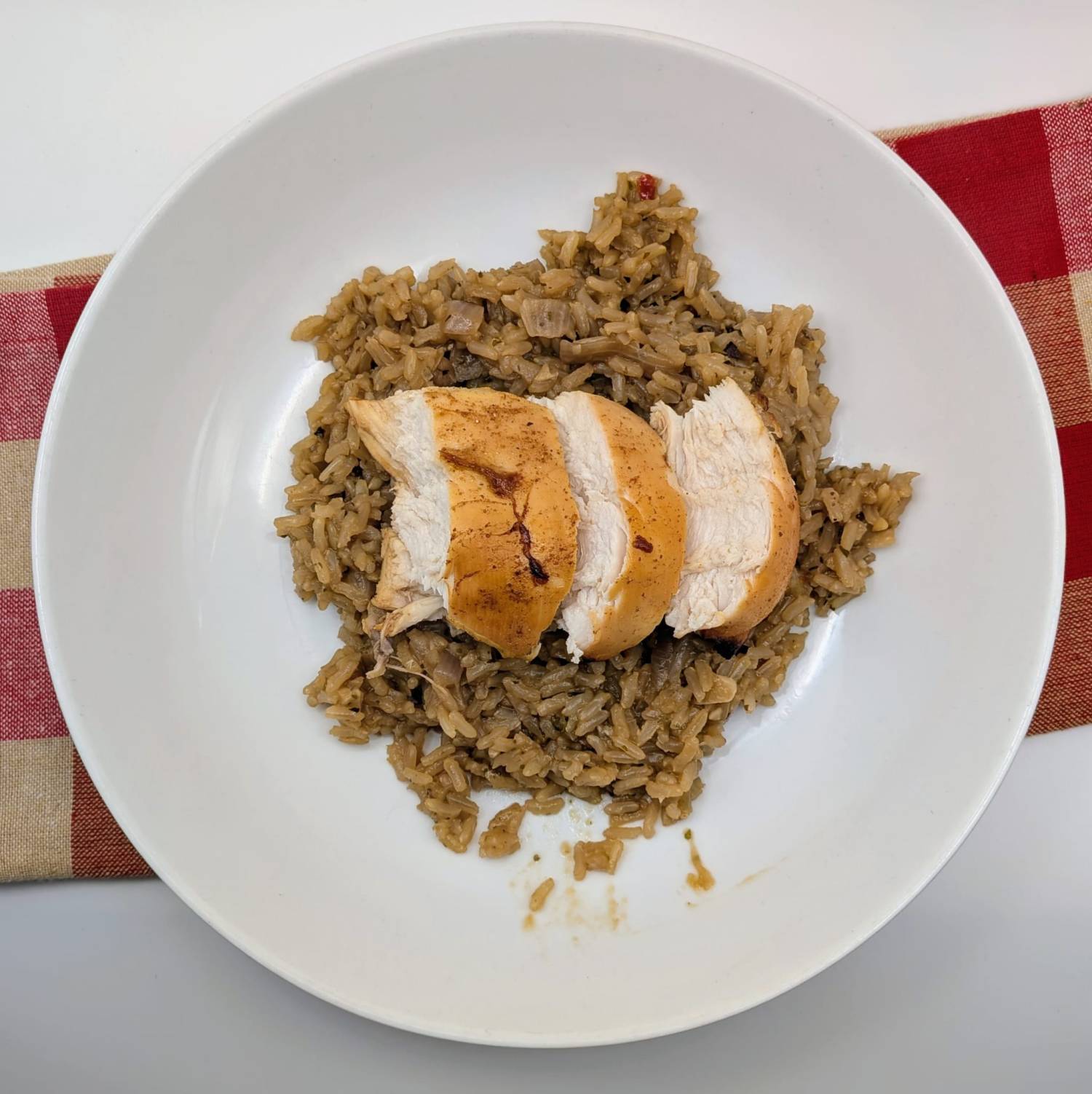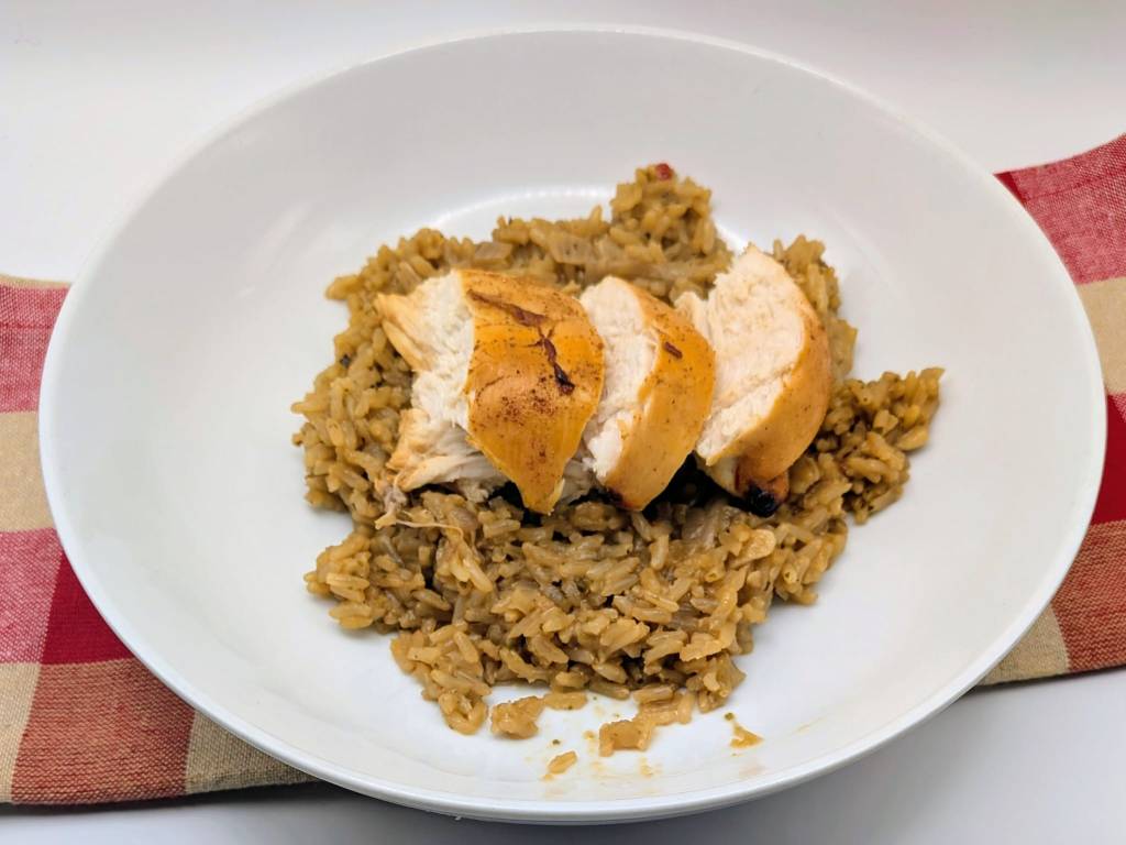 - Slice the chicken and serve with the rice.