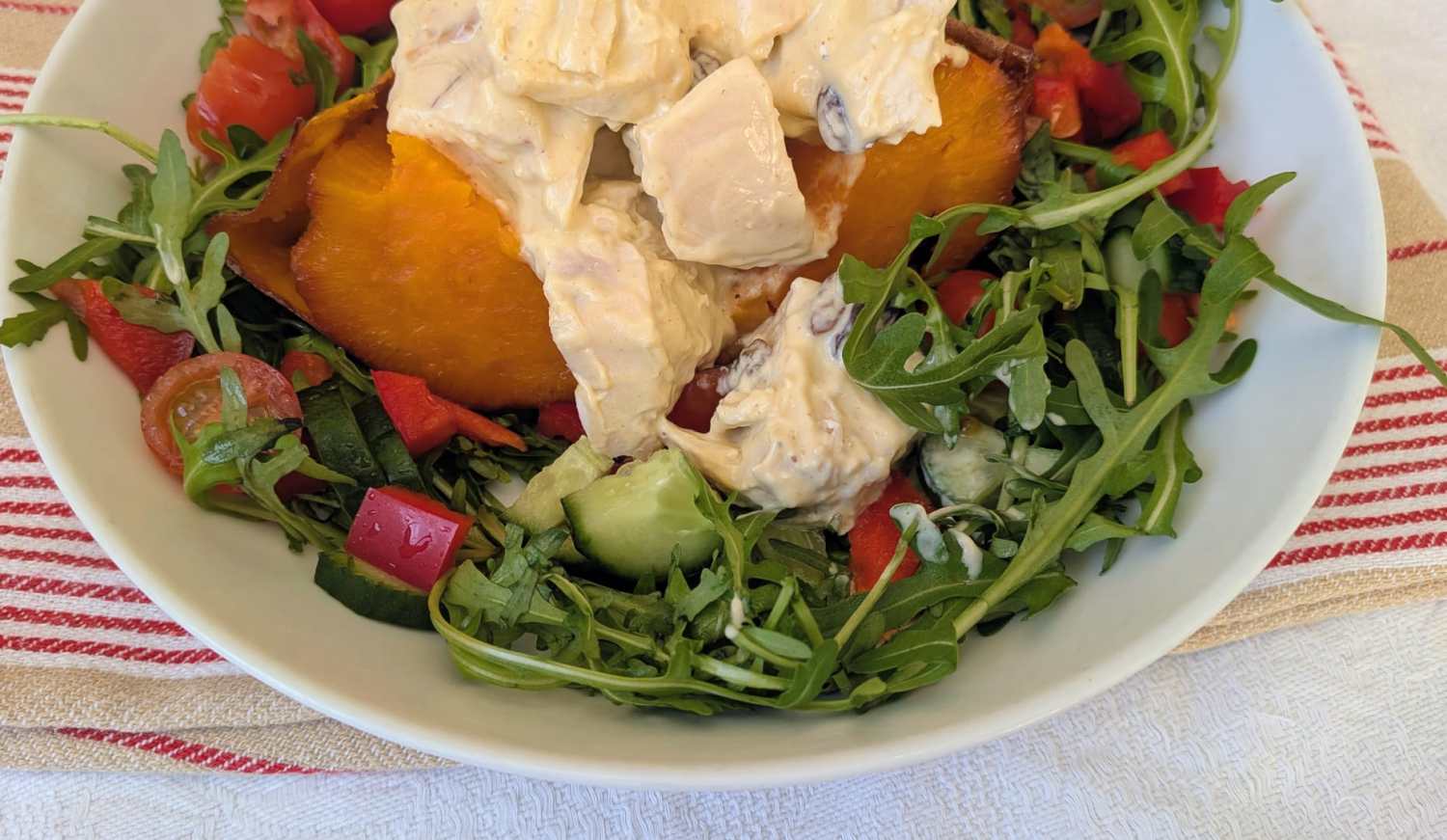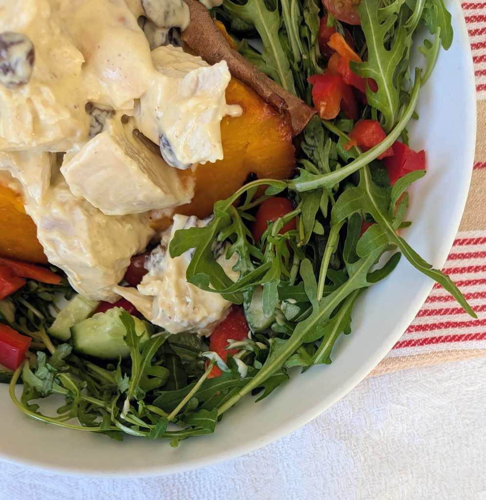 - Cut the jacket potatoes in half and spoon in the masala mayo chicken into each jacket.