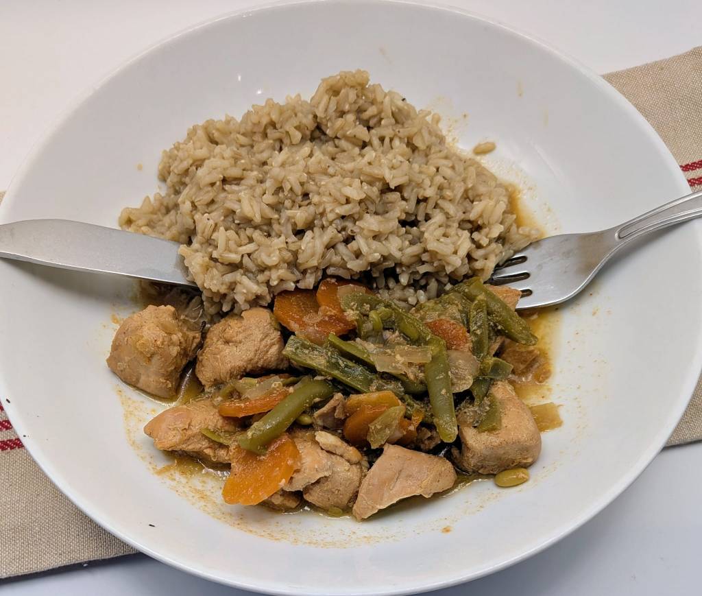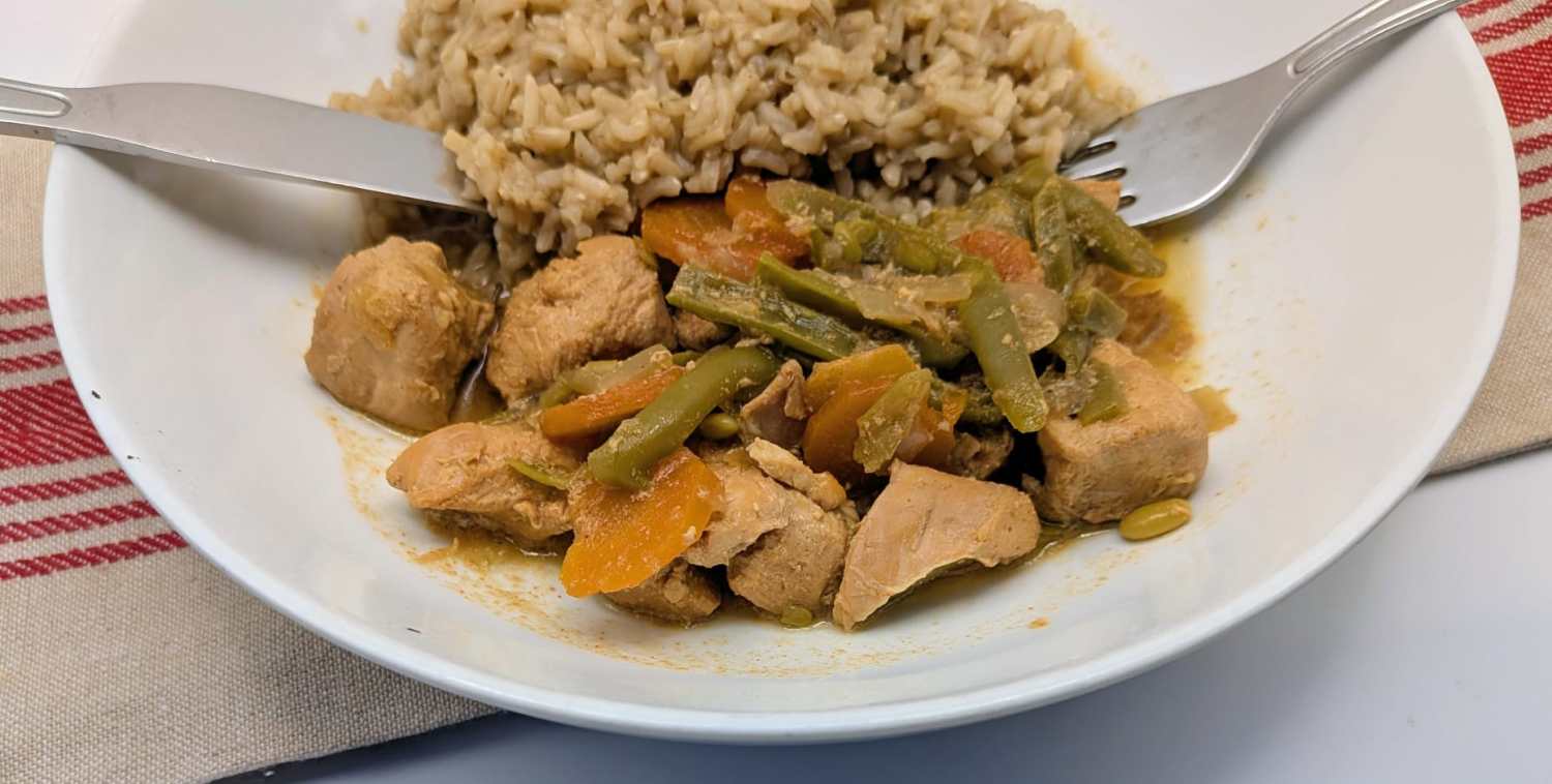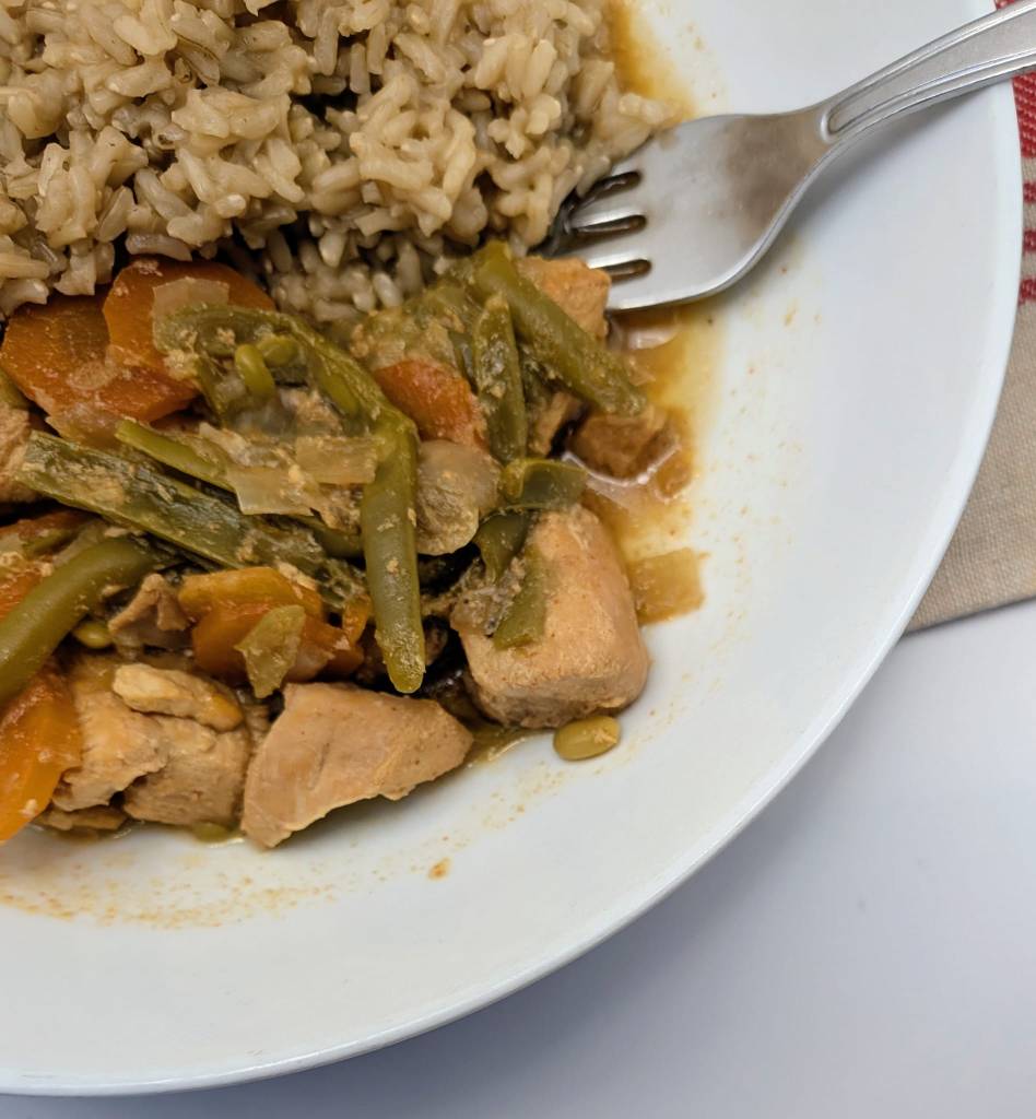 - Place the chicken into the slow cooker pot along with the carrots, onions, garlic, green beans and the chicken stock mixture made earlier.