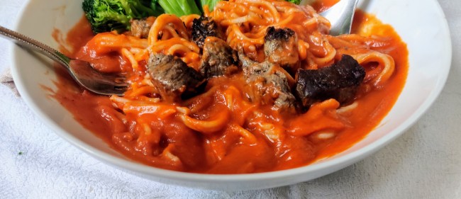 Recently I made this dish and I cooked the beef in the sauce. Nowadays I have a very fussy eater on my hands and he isn’t the biggest fan of my tomato sauce. Instead of cooking the beef stewing steak …