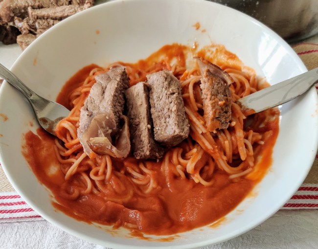 Recently I made this dish and I cooked the beef in the sauce. Nowadays I have a very fussy eater on my hands and he isn’t the biggest fan of my tomato sauce. Instead of cooking the beef stewing steak …